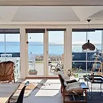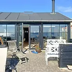 Cette villa A Sparkling Sea View And Waves In Juelsminde comprend une cuisine équipée équipée d'une bouilloire électrique, d'un réfrigérateur et de la vaisselle.